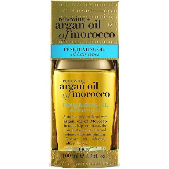 - RENEWING HAIR OIL: The 3.3-ounce container of OGX Renewing + Argan Oil of Morocco Penetrating Hair Oil Treatment gives hair a renewed look and feel of silky perfection and radiant shine